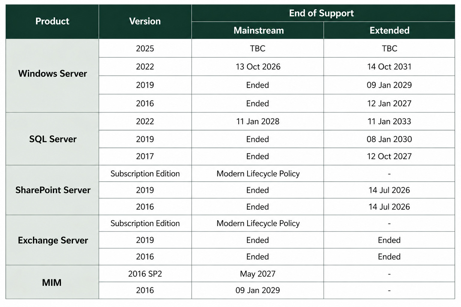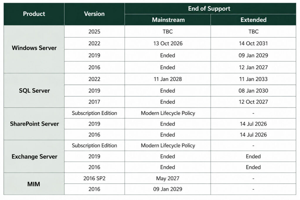 The earliest end-of-support date is for SharePoint Server 2019. Among all the platform components that underpin MIM, SharePoint provides the least direct functionality – it simply hosts the MIM Portal solution. The data for the portal, as well as the Workflow functionality, is provided by the underlying MIM Service and Windows Server components, such as Windows Workflow Foundation.